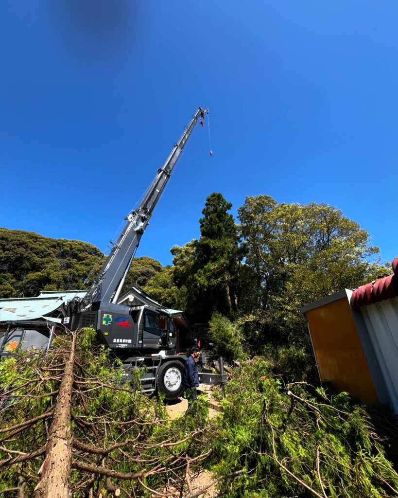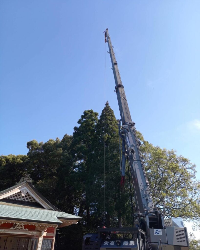 歴史ある神社の境内ということもあり、他の樹木や建造物を傷つけずに作業を行う必要がありました。
